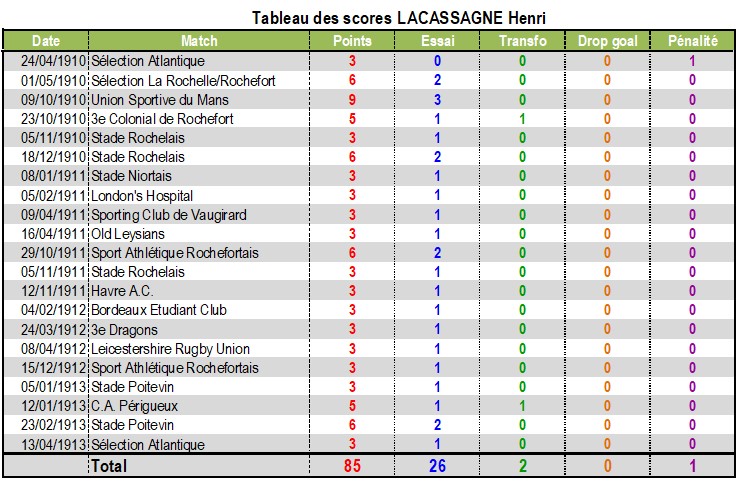 LACASSAGNE Henri 27/12/1883 - 14/09/1918 Poste : Trois Quart
